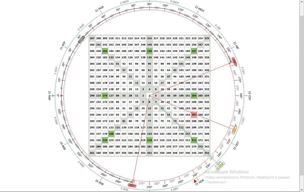 225-169=56, 56/8 = 7 - ячейка 207 лежит в 7-м цикле. И самое интересное, что до ячейки, лежащей на 0° тоже 7 ячеек от начала цикла, т.е. на 0° будет ячейка с номером 169+7=176.