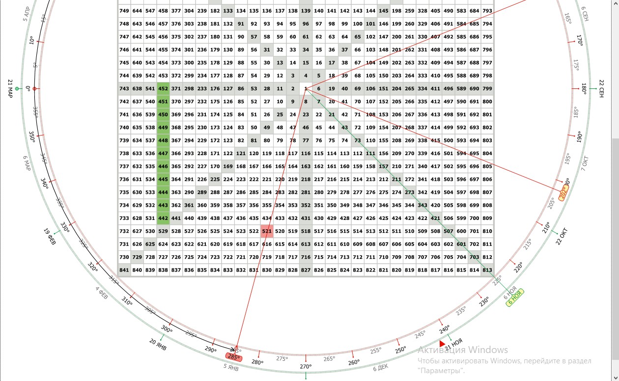 Кстати, до меня только дошло (а не надо удивляться и злорадствовать, что только сейчас...), как Ганн считал градус ячейки вручную... Для этого нужно знать номер цикла... а значит и количество ячеек в цикле... Далее достаточно вычислить номера ячеек на углах 0°, 45°, 90°, на 135° чётный квадрат, 180°, 225°, 270° и на 315° также известен нечётный квадрат... Ну а далее - позиция ячейки в секторе 45° легко вычисляется...