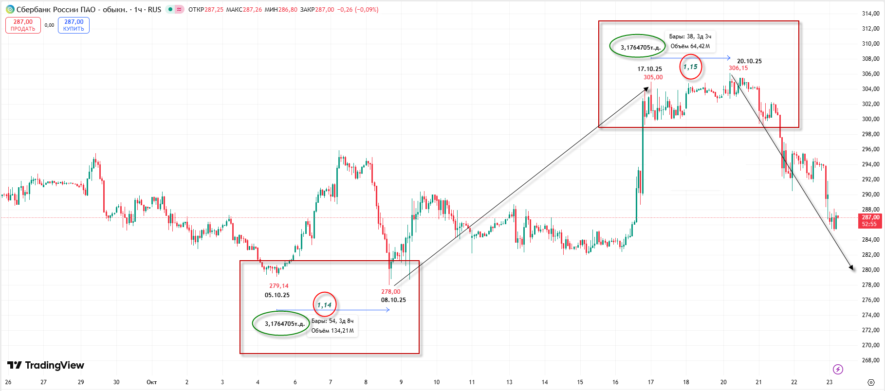 Или вот еще одна картинка. На этот раз акции Сбербанка, часовой график. Наверное, это уже не движение вверх-вниз, а образование моделей, но тоже, в общем, может считаться симметрией и зеркальным отражением и, соответственно, позволяет спрогнозировать направление движения.