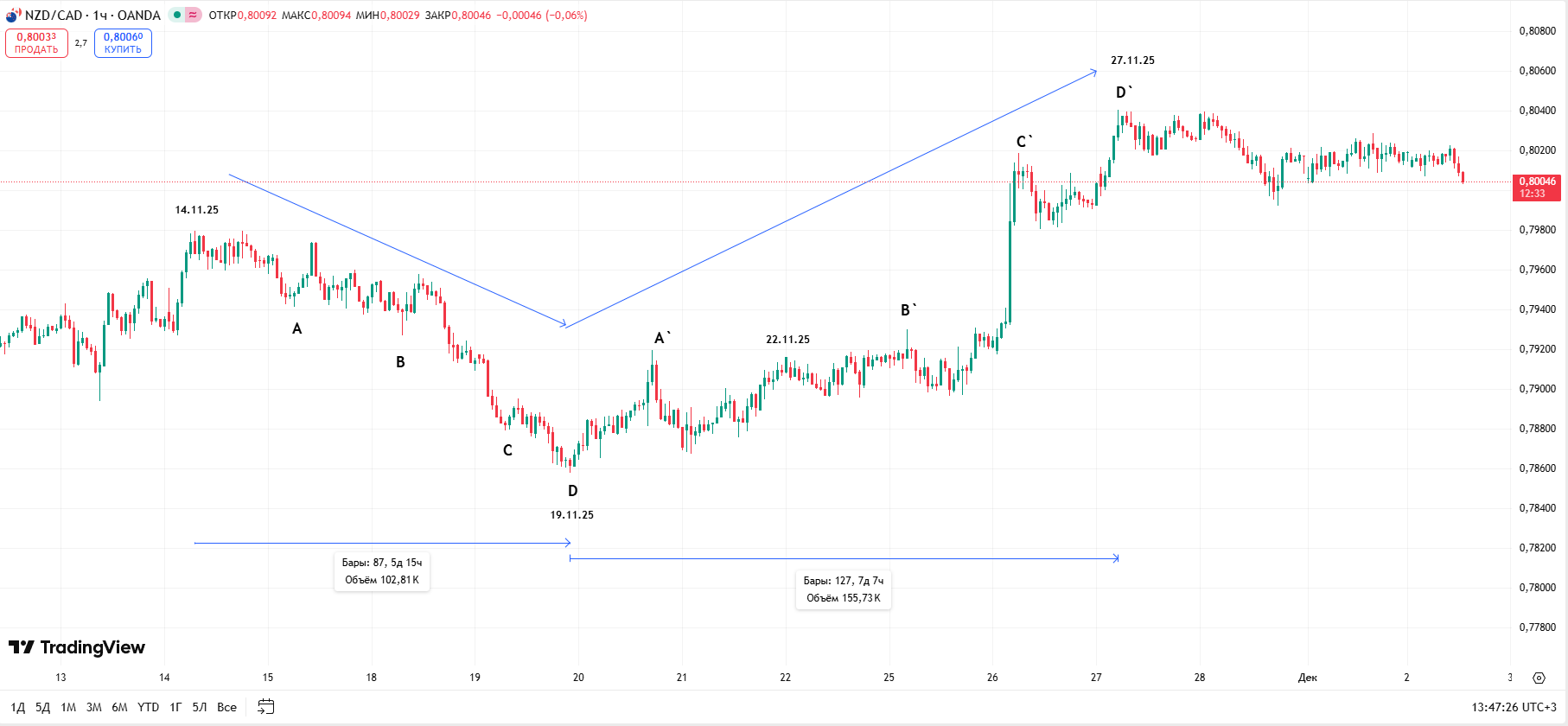 Для иллюстрации взял часовой график NZDCAD, совсем недавнее прошлое. Да, несомненно, зеркальность структуры присутствует. При очень грубом приближении количество оснований движения вниз равно количеству вершин движения вверх. И наверное, если ты находишься, к примеру, в точке D, ты сможешь определить направление движения.